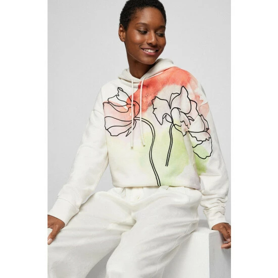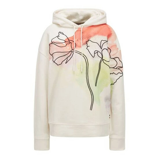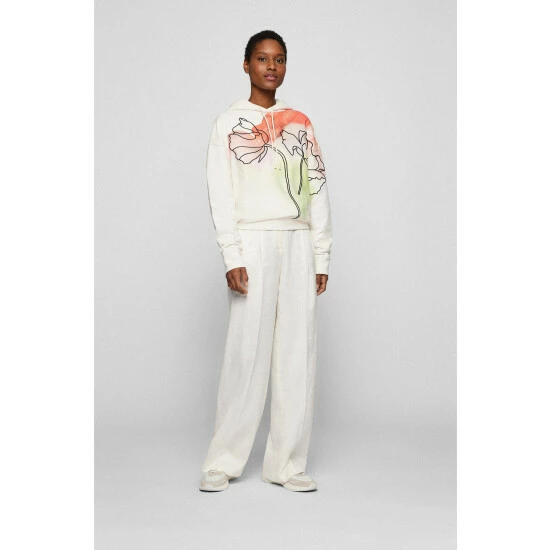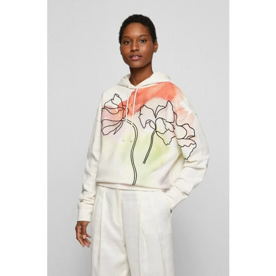 This hoodie features placed watercolour print, black lines yarn embroidery, small BOSS logo at chest, iconic stripe tape at centre back neck and as flag at left side seam.
